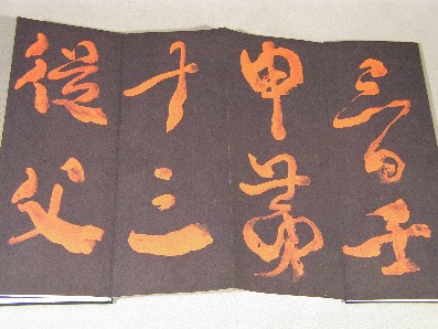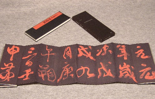 | 1988年11月、書玄刊(B4半截変型折帖、72P、8800円) 戦後の前衛書・現代書の旗手であった上田桑鳩は、臨書において天才的な手腕を発揮、臨書を芸術に止揚せしめた最高の書人として過言でない。 その桑鳩が最晩年、漆黒に塗りつぶした折帖に朱書した傑作が数点遺されている。 香川・中原一耀氏宅で本書を披見した飯島は、その空海の書法と顔真卿の書法が混然とした激しい表現力に感動、出版各社に刊行を推めたが叶わず、やむなく自費出版したもの。 全文カラー影印し、朱書を精妙に復元した。好評で、即完売。 撮影/飯島太千雄 制作/書玄 |