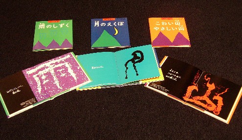 | 1995年11月、小学館刊(B5変型、各冊18P、全Pカラー、各冊850円) 「雨のしずく」・「月のえくぼ」・「こわい山、やさしい山」 類書は、漢字の意味や構成、成りたちを説く本だが、本書は違う。本書は、一つの漢字が、どんなに多様で面白い表情をしているか、それを楽しむ本である。 面白がって、自ずと覚え、漢字ってこんなに面白いものか、そう感心する本である。本書に寄せられた、多くの子供の反応がそれを裏付けている。 本書の最大の壁は、1冊で1字しか……といった親の効率主義的な常識である。しかして、絶版。 飯島は、日本と中国の無量厖大な書から選字し、児童書翻訳家・乾侑美子が、飯島のもらす片言隻語から子どもにアピールすることばを拾い上げて文を作り、グラフィック・デザイナーの根本孝・圭子が刺激的な色をつけ形にした、ユニークな絵本である。 |