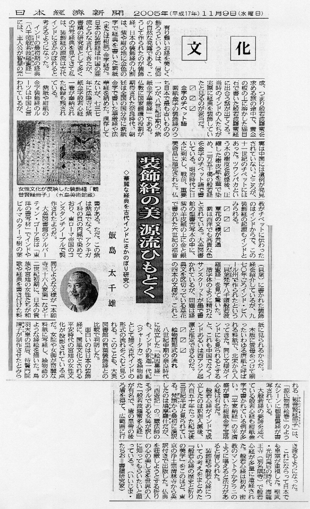 ◆経典を美しく荘厳した日本の装飾経は、これまで中国の亜流と考えられて来た。しかし、本書で飯島は、その源流を2・3世紀頃の、古代インドに求めるべきと論証する。僅かに現存する大英図書館所蔵の、インドの貝葉梵字装飾経と日本の奈良・平安時代の装飾経を図示、比較しつつ、飯島の推論は進む。単に、日本の仏教美術史にとどまらず、世界の美術史に一石を投じる画期的な論が、この本で美しく展開される。 |